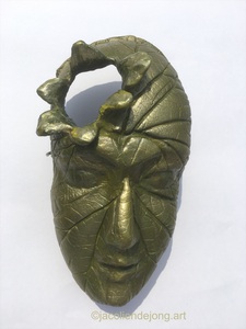 Masker van klei met daarin verwerkt de bloesem van de mannelijke tamme kastanje, beschilderd met goudverf, wandobject met draad voor ophangen
