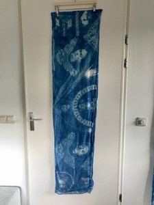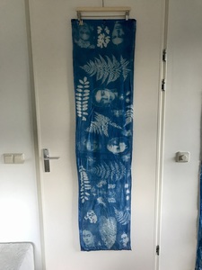 Sjaal 100% zijde met Frida Kahlo (M) in cyanotypie blauwdrukken. De sjaal is handgemaakt met de cyanotypie blauwdruktechniek, een fototechniek uit 1843 waarbij je met zonlicht planten en foto's op textiel print. Iedere sjaal is uniek. De kleur is blauw. De sjaal is kleurvast. Zijde is een natuurproduct en moet met de hand, koud gewassen worden,niet met synthetisch wasmiddel. Deze sjaal is een echte eye-catcher .Je kunt de sjaal ook als banner aan de muur hangen. Op de foto zie je een houten letter, deze is bedoeld om het verschil tussen de verschillende sjaals aan te geven.